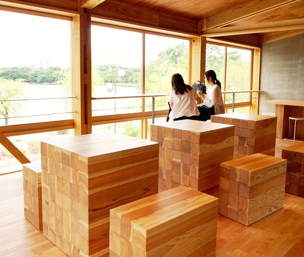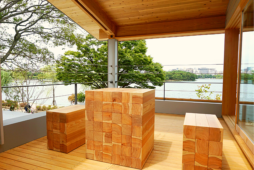 2階はレンタルスペースになり、杉で造られたテーブルと椅子など、ふんだんに木材を使われている落ち着く空間です。二人だけでもレンタルできますので、友人や家族、小人数の集まりはちょうどいい感じです。2階から大濠公園の広がる景色も必見です!