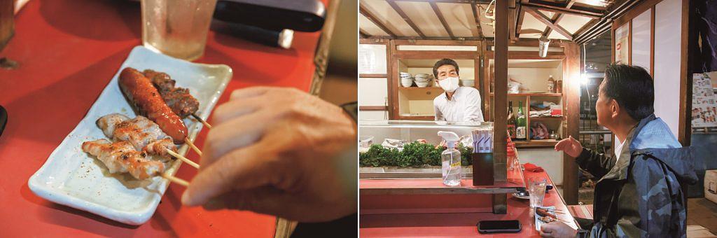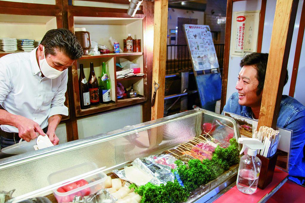 串焼は1本100円~。(写真左)一週間の出来事を大将と話すのも、ここでの楽しみ。(写真右)