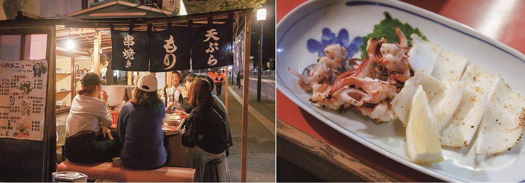 その時を共有している者同士で仲良くできるのも、屋台の醍醐味のひとつ。明太子の話題で盛り上がっていた。(写真左)彼女たちが食べていたのは、身がムチッとして旨い「いか焼」600円~800円(写真右)