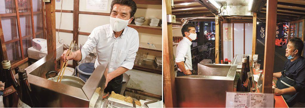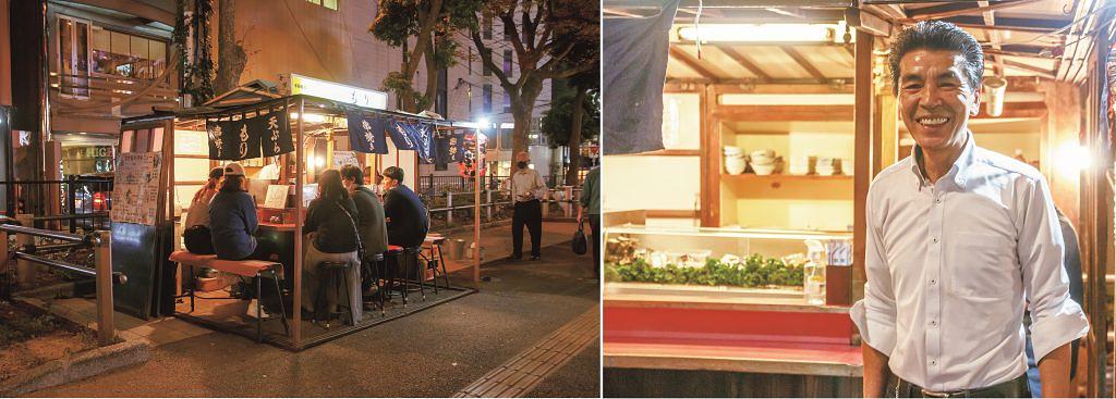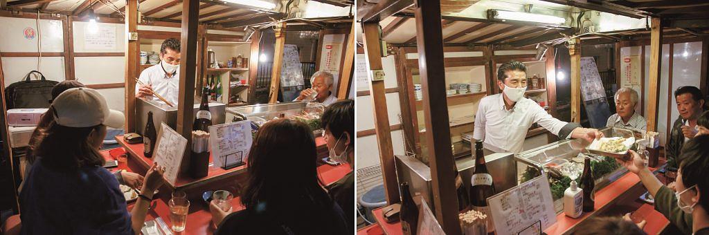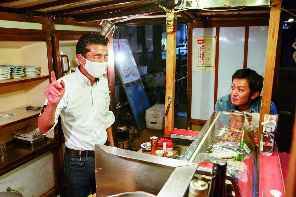 県外のお客も最近また増え出し、その土地土地の話が聞けるのも、店主 森さんの楽しみ。(左)「屋台の数が少ないし人も少ないから寂しいね」と山田さん。10年前の屋台の活気とは違い、このコロナ禍の屋台の状況に寂しさを感じられたことを語られていた。(右)