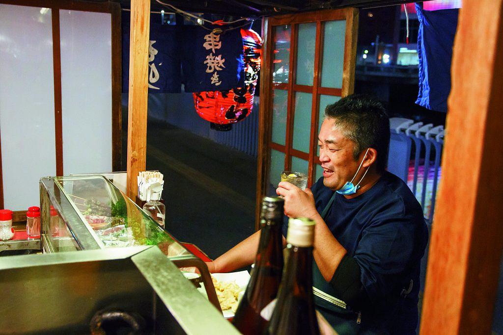 人波も落ち着き始めたpm9:00過ぎ。常連客が帰りひと段落した屋台に現れた男性。森さんと挨拶を交わして親し気な様子だ。