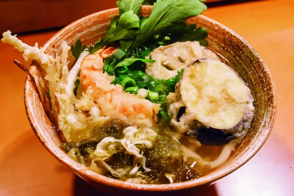 創業以来かわらない手法で作られる、あっさりの中に味わいの効いた優しい味のスープ。うどん好きの福岡県民に愛されている屋台〆の一杯が、ここ「大政」のうどん。柔らかい麺の上にはエビ・なすや金時草など、季節の野菜3種の天ぷらがトッピング。毎日こだわりの食材を野菜は糸島、海鮮は長浜市場から仕入れています。開店直後からこの一杯を求めお客さんが来られるのも納得。リーズナブルさもあり人気です。