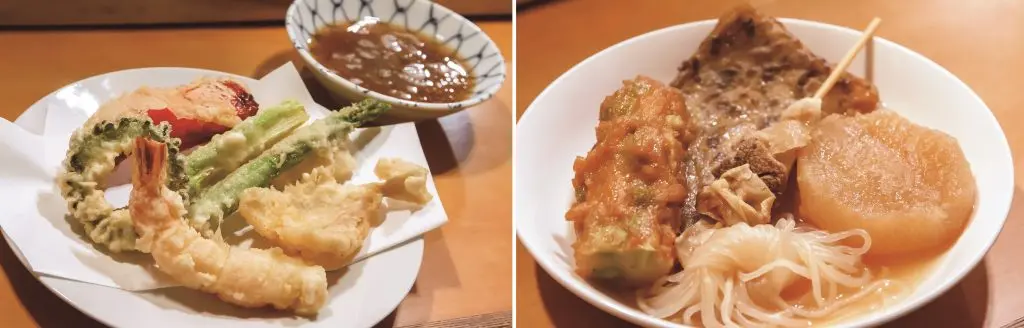 屋台の真ん中に置かれたおでんは、ダシがしっかり浸みた深い味わい。きくらげ天やえだまめ天など珍しいものから、大根など定番のおでんネタまで、種類も豊富です。