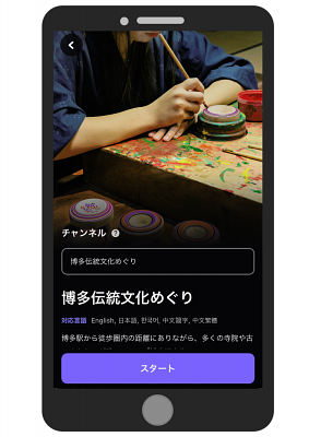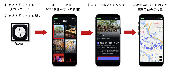 現実世界に音声を重ねる拡張現実(音声AR)の技術を使って、自分のスマートフォン等に専用アプリをダウンロードしておくだけで、いつでも、自分の都合がよい時間帯に、観光スポットの音声ガイドや今回新たに作成したオリジナルの音声ドラマを楽しみながら、博多旧市街のまち歩きを楽しむことができるまち歩きガイドコンテンツです。(博物館や美術館の音声ガイドが街中で楽しめるイメージです。)