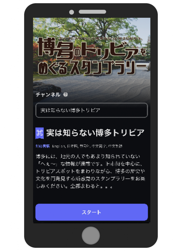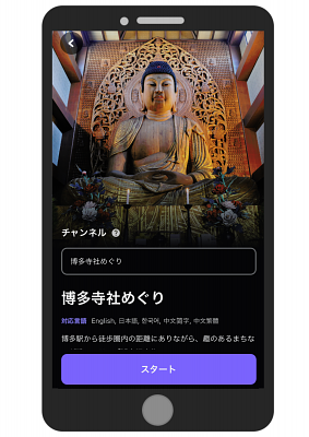 チャンネル(コース)は4つ!博多旧市街の観光モデルコースをベースに寺社仏閣などの観光スポットやストリート等を紹介する「博多寺社めぐり」と「博多伝統文化めぐり」の2コースと、オリジナルキャラクター「ナガマサ」が、戦火により荒廃した中世博多のまちを復興していくオリジナルの音声ドラマを楽しむ「博多流~はかたながれ~」、デジタルスタンプラリー「実は知らない博多トリビア!」です。