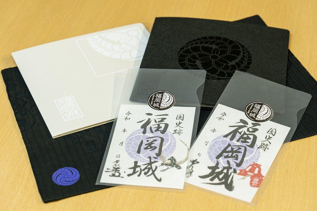 登城記念にコレクションするお城ファンが多い「御城印」を福岡城でも販売しています。当初は黒田藩初代藩主・黒田長政バージョンのみでしたが、期間限定だった黒田官兵衛バージョンも通年販売するようになりました。福岡城の家紋「藤巴」や、官兵衛、長政それぞれを象徴する兜、戦国武将が使っていた花押(かおう)がデザインされています。各1枚300円で、「福岡城むかし探訪館」と三の丸スクエア内「まゆの館」で販売しています。まゆの館では、オリジナル台紙(1200円)やオリジナルクリアファイル(御城印∔100円)も用意しています。