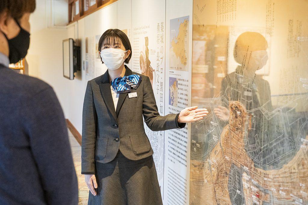 また、古地図の展示もあり、現在の地図と見比べて位置の比較などをするのも楽しみの一つです。また、案内カウンターでは城内の見どころやおすすめスポット等を紹介しています。「福岡城跡や鴻臚館跡を訪れる前に足を運んでいただければ、より散策を興味深く楽しんでいただけると思います」とスタッフの西田さん。