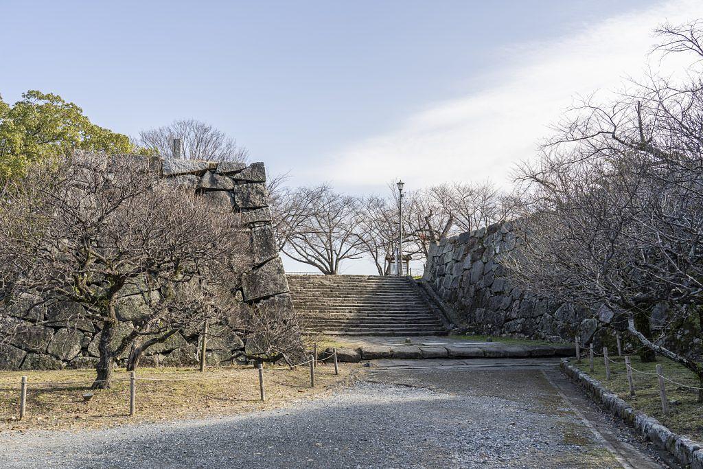 二の丸北側から本丸に入るために設けられた表御門があった場所です。現在は櫓台となった石垣や階段が当時のままの姿で残っています。表御門は、1918(大正7)年に黒田家の菩提寺である崇福寺に払い下げられ、現在は「崇福寺山門」として県の文化財に指定されています。