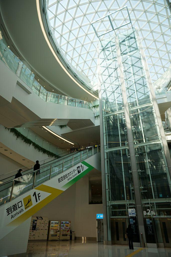飛行機に搭乗するときは1階にある航空会社カウンターで手続きを済ませたら、エスカレーターで2階へ!
