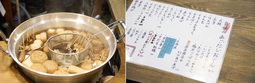 大将のイチオシは、福岡の老舗豆腐店「三原豆腐店」の「まぼろしの厚揚げ」(220円)を使ったおでん。一つひとつ手作りされ、そのままでも十分においしい厚揚げをおでんにしたなんとも贅沢な一品です。