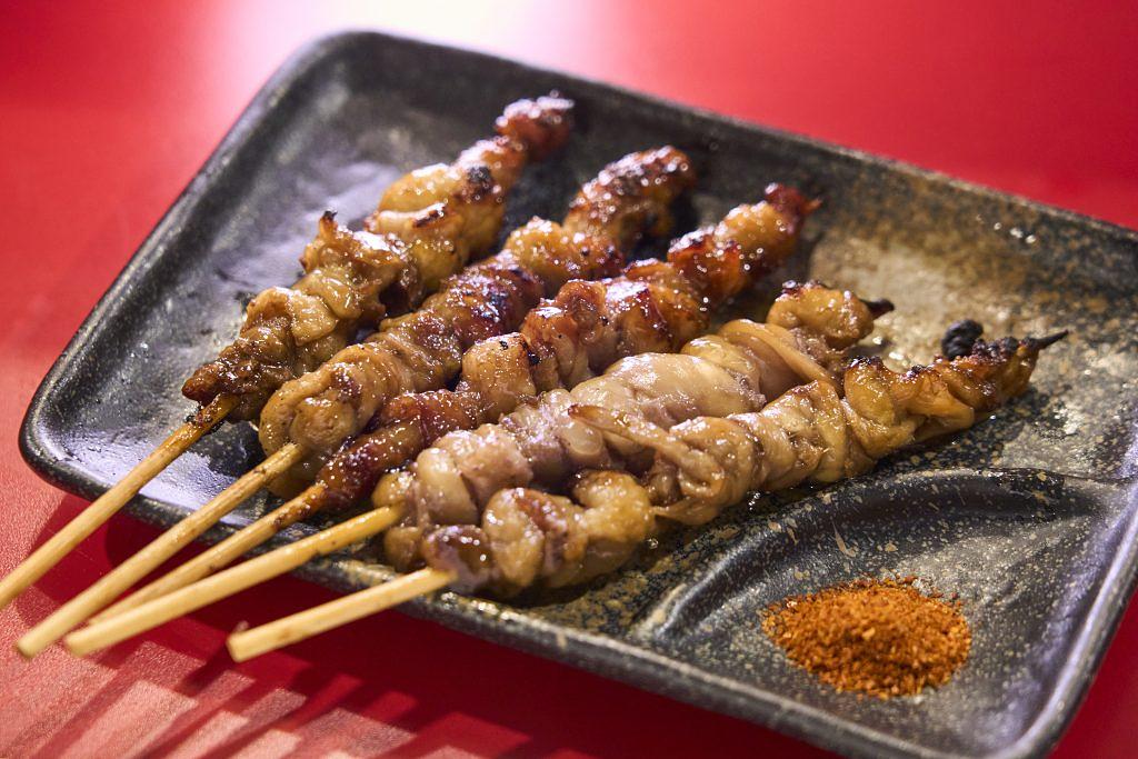 まずは、博多名物「ぐるぐる鳥皮4本盛り」(800円)から。炭火でこんがりと焼かれた鳥皮は、カリッと香ばしくクセになる特製の甘辛いタレがさらに胃袋を誘惑。1本食べたらまた1本、もう1本と手が止まらなくなるので要注意です。