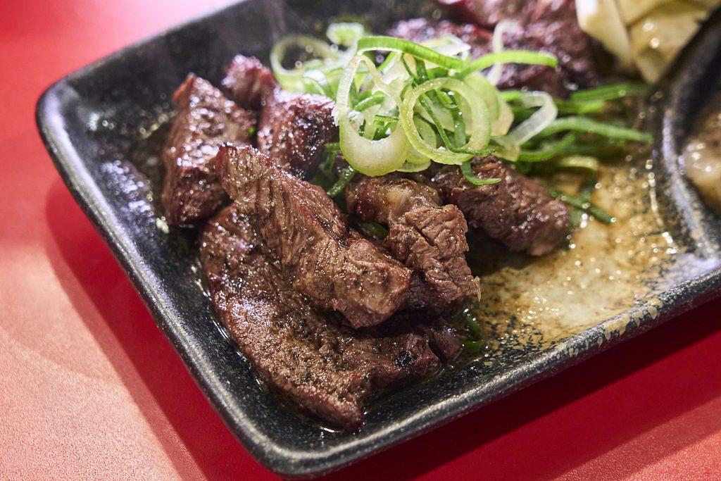 続いて、メインは「牛サガリ」(900円)。焼き場で火を通した後は、高田さんが目の前で最後の仕上げをしてくれます。中洲の綺麗な夜景を横目に、屋台で牛ステーキを食べるという贅沢ができるのも中洲の屋台ならではの魅力ですよ。