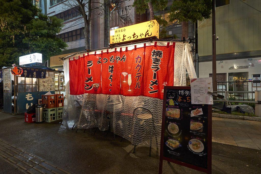 夜のまちを一段と華やかに楽しみたいなら、天神に次いで屋台が多く集まる中洲がおすすめ。清流公園の北側に店舗を構える「博多屋台 よっちゃん」は、福岡市内で営業する屋台で最年少の店主・高田吉昌さんが切り盛りしています。