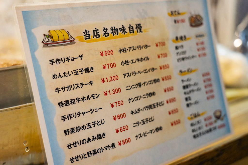 昭和通り、福岡銀行本店前。いくつかの屋台が軒を連ねるなか、ひときわ目立つ青色ののれんが「雲仙」の目印です。メニューを見てまず目に入るのが「当店名物味自慢」と書かれたおすすめ枠。「手作りギョーザ」(500円)や「めんたい玉子焼き」(700円)といった屋台の定番料理から始まりますが、よく見てみると「小柱・アスパラバター」(700円)や「せせりと野菜のトマト煮」(800円)といった洋食メニューも並びます。