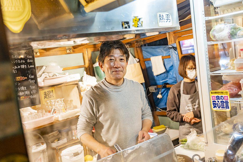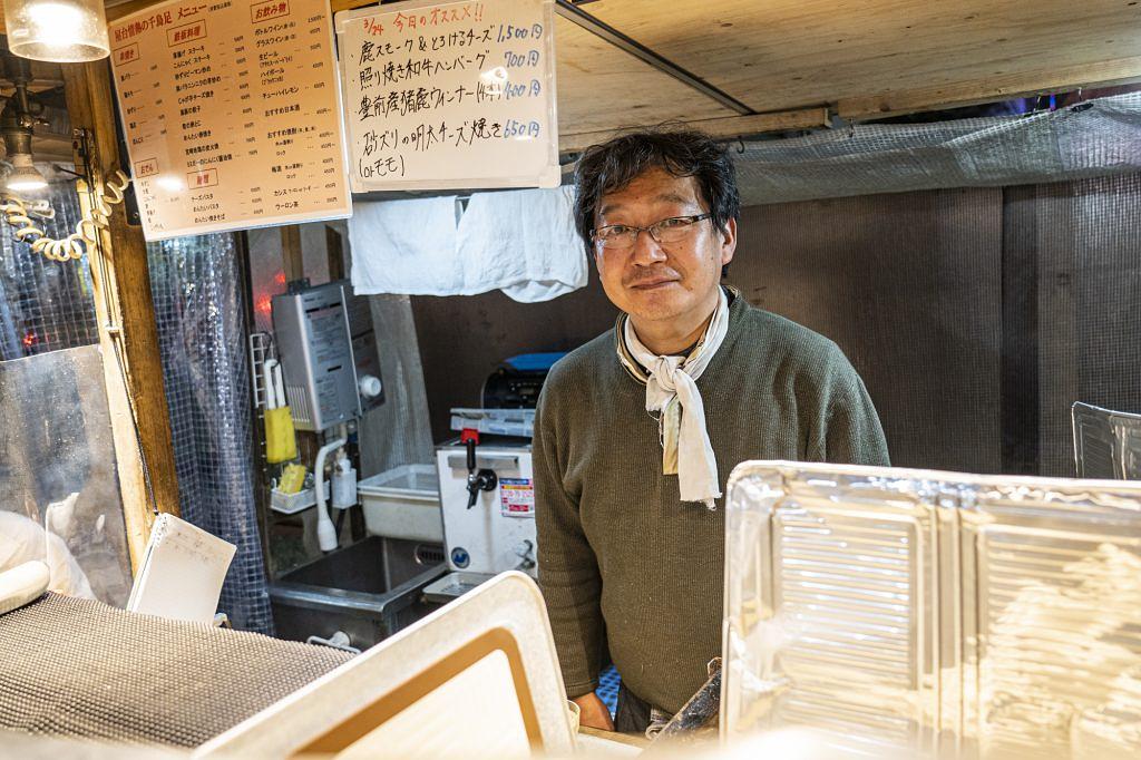 地下鉄やバスでアクセスしやすく、買い物帰りにもすぐ立ち寄れる「天神ロフト」前は若い世代や観光客が特に多いエリア。並びの3軒の真ん中にある「ジビエ料理屋台 情熱の千鳥足」では、大将の東耕一郎さんが2017年から営業を続けています。