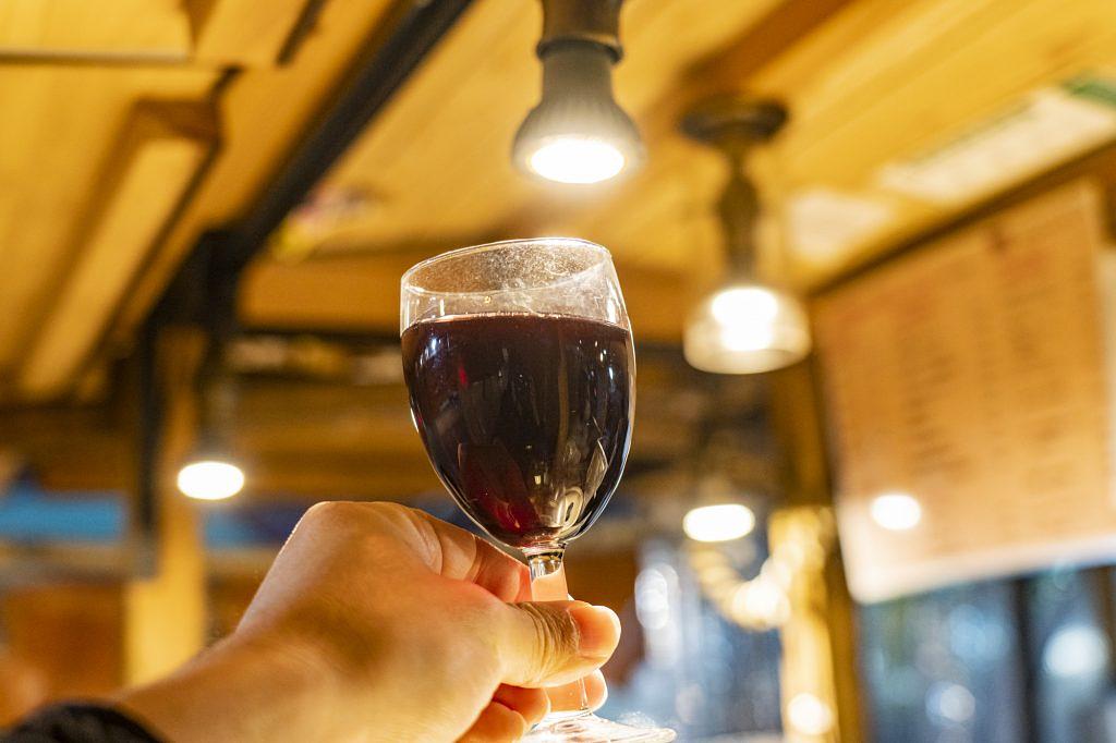 料理に合わせるなら赤ワインか。そう思ってグラスワイン(450円)を頼んでみると、いっぱいに注いでくれました。