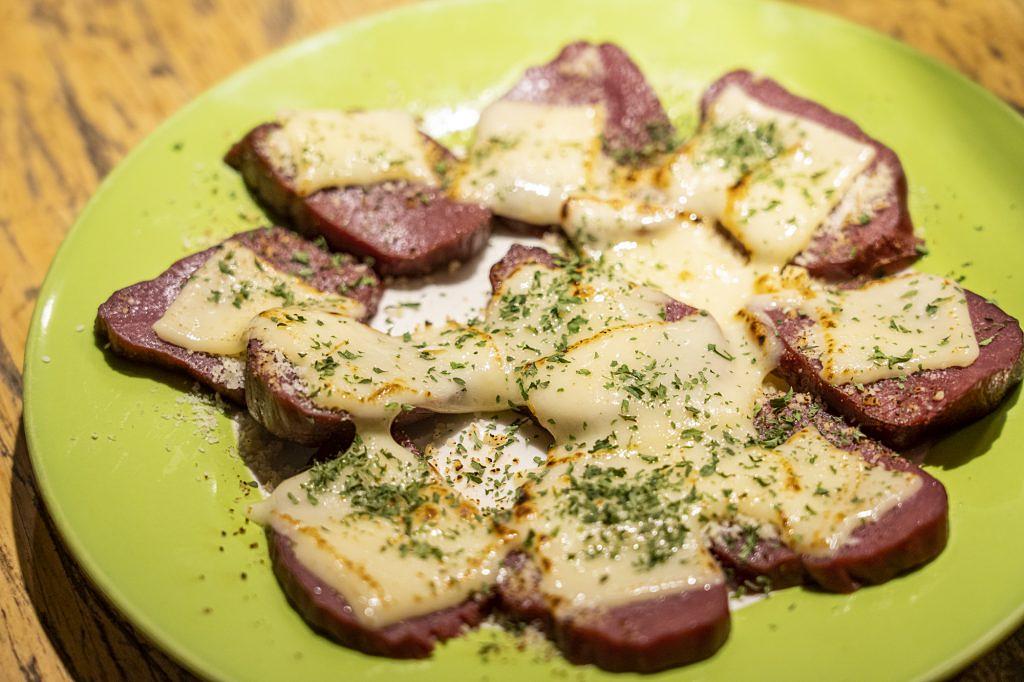「鹿のスモーク&とろけるチーズ」(1,500円)には、熊本県球磨郡・水上で獲れた鹿を使います。まったりと濃厚な鹿のスモークとチーズの風味が溶け合って、赤ワインと相性抜群! 1枚ずつちょうど良いサイズにスライスされているので女性でも食べやすく、時間をかけて食べるおつまみにもぴったりです。