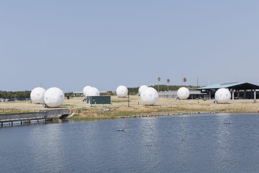 特に目を引くのは、カモ池前にずらりと並ぶ13個の球体テント。直径6mとおよそ2階建てほどの高さがあり、階段をのぼって客室に入ります。中に広がるのは柔らかい光に包まれた非日常の空間。公園内でゆったりと一日を過ごせるよう、レストランでのモーニングとフレンチコースのディナーがセットになった宿泊プランが用意されています。暗くなるとテントに明かりが灯り、辺りは幻想的な雰囲気に。夜の様子を見ることができるのは、宿泊者の特典ですね。
