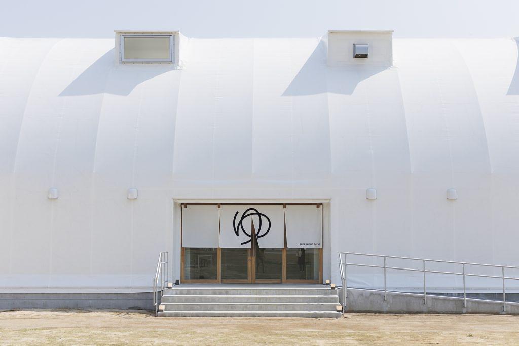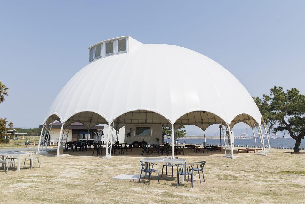 博多湾の海岸沿いにあるのは、球体テントと同じ素材で造られた「お風呂棟」。「ゆ」の文字の暖簾が懐かしくもスタイリッシュです。高い天井をもつ銭湯のような空間の中にお風呂や水風呂、屋外スペースがあります。波の音を聞きながらお湯に身を任せると、ついつい長風呂してしまいそうですね。