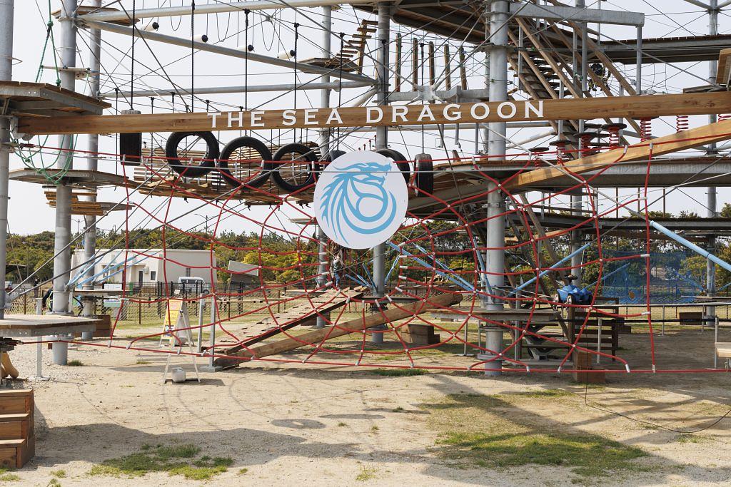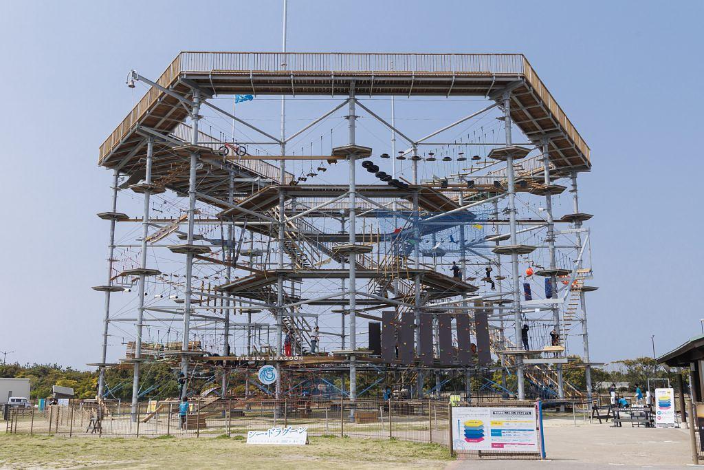 神奈川県「マッスルモンスター」や大阪府「万博BEAST」を手がけたチームによる、九州初&国内最大規模の巨大アスレチックタワー「シー・ドラグーン」。高さ約17mにも及ぶ六角形の木製タワーは公園内で圧倒的な存在感を放っています。