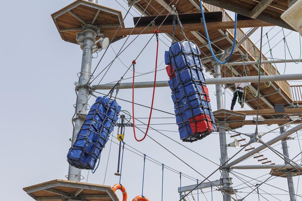 2~4階は、身長125cmを超える小学生以上向けの「アスレチックコース」。特にコースは設けられていないので、自由に92種類のアスレチックアイテムを楽しめます。安全器具があるとわかっていても足がすくみそうなアスレチックばかりで、挑戦する人たちの掛け声や悲鳴が響いていました。1階には身長100~125cm、体重40kg未満の子どもを対象とする「キッズコース」があります。