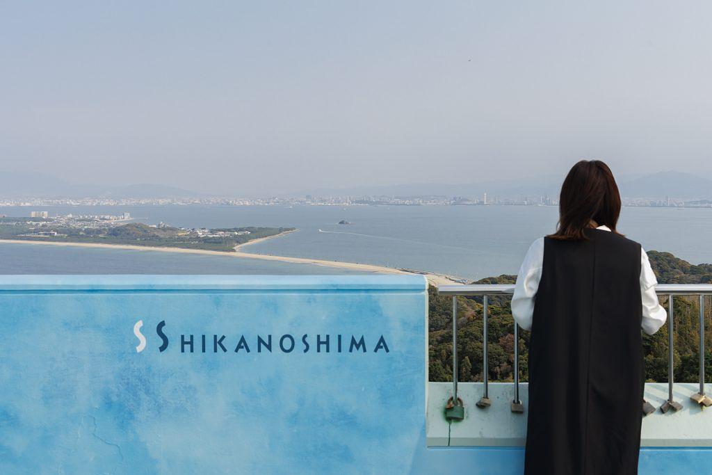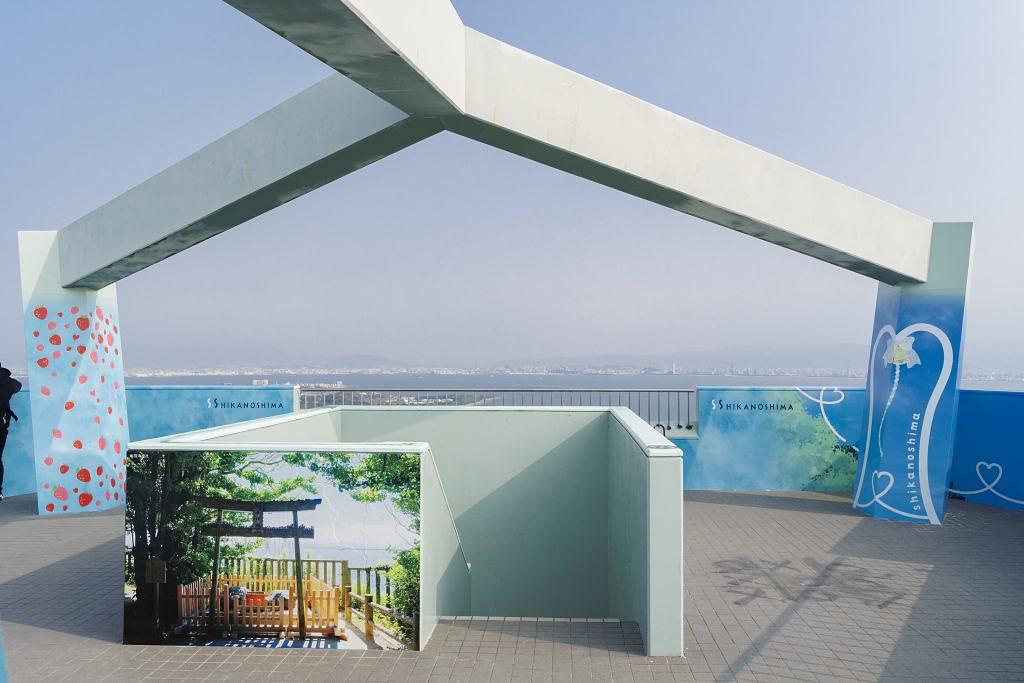 志賀島の一番高い場所にある「潮見公園」の展望台から、海の中道や博多湾、玄界灘など360度のパノラマを眺めることができます。今回、展望台がフォトスポットとしてリニューアル。志賀島のいちごや、青空に映えるベル、志賀島のマップなど一緒に写真を撮りたくなるものばかりです。