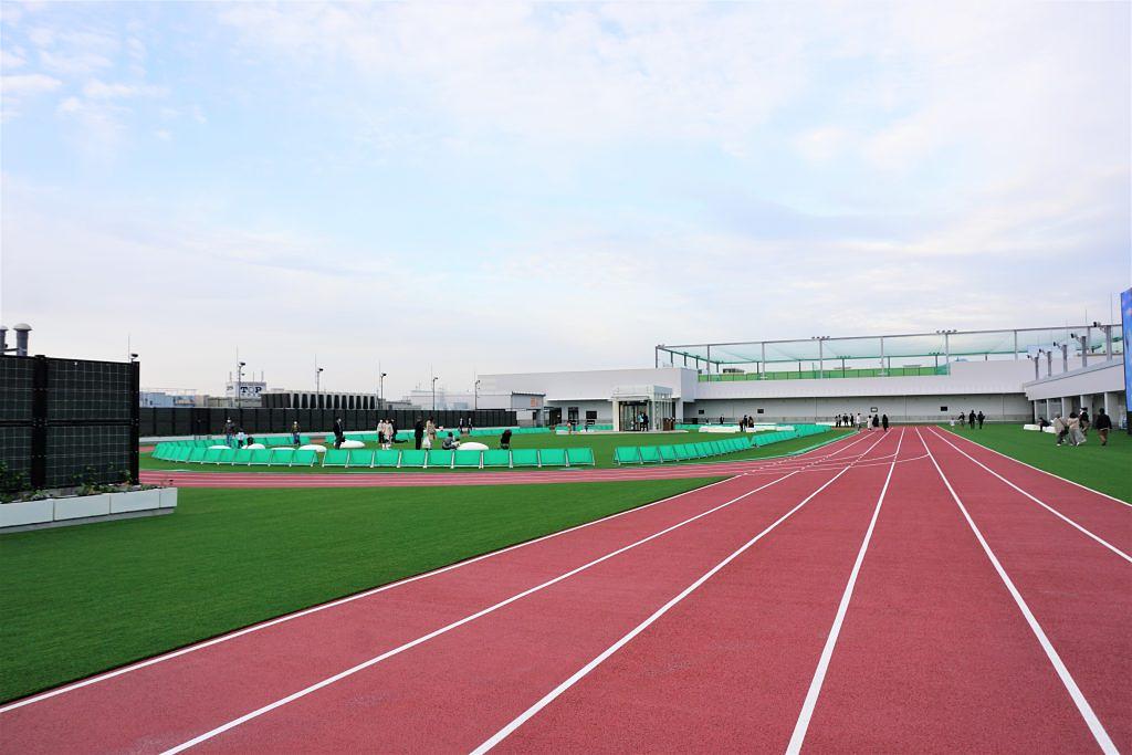 「ららぽーと福岡」の屋上には、様々なスポーツを楽しめるフィールドが広がっています。開放的な広いフィールドでは、200m陸上トラックやテニスコート、3x3バスケットボールコートを始め、大型ビジョンを使用したパブリックビューイングなど、いろいろなスポーツやイベントが楽しめます。