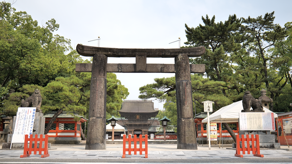 御本殿近くに立つ一之鳥居(国指定重要文化財)は、柱が三段に切れた独特の構造。慶長14(1609)年、藩主黒田長政が建立したとわれています。