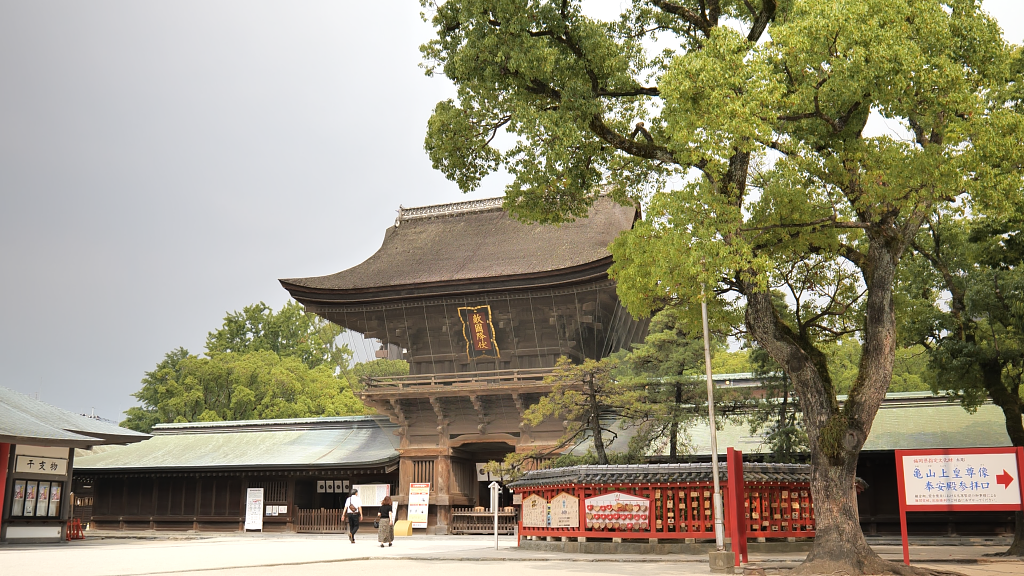 本殿と拝殿の屋根はいずれも見事な檜皮葺(ひわだぶき)。楼門には、御神宝である「敵国降伏」の御宸筆(ごしんぴつ)を謹写・拡大した扁額が掲げられています。他にも、千利休より奉納されたといわれる石灯籠や蒙古軍船の碇石など、国指定・県指定の重要文化財が多く残されています。