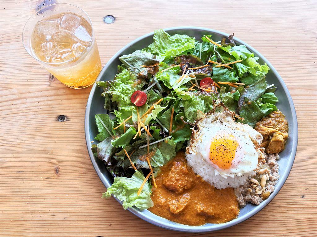 カフェの人気メニューは、2~3種類のカレーとたっぷりの野菜をワンプレートで味わえる 「筥崎荘々 カレー』。台湾茶 中国茶 日本茶などをいただける喫茶も行なっています。