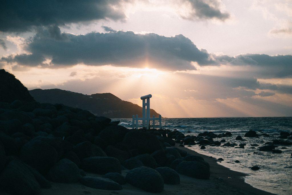 最後は、糸島茶房の正面にある糸島半島の観光名所「二見ヶ浦」で締めくくります。「日本の渚100選」「日本の夕陽100選」に選ばれていて日頃から綺麗な夕日が楽しめる「二見ヶ浦」。二見ヶ浦のシンボルともいえるのが「白い鳥居」とその奥に海面から顔を出す「夫婦岩(めおといわ)」です。夏至の頃には、夫婦岩の間に夕日が沈み、神秘的な光景が見られます。美しさと儚さを漂わせる光景を眺めながら、ロマンチックな時を過ごしてみてください。