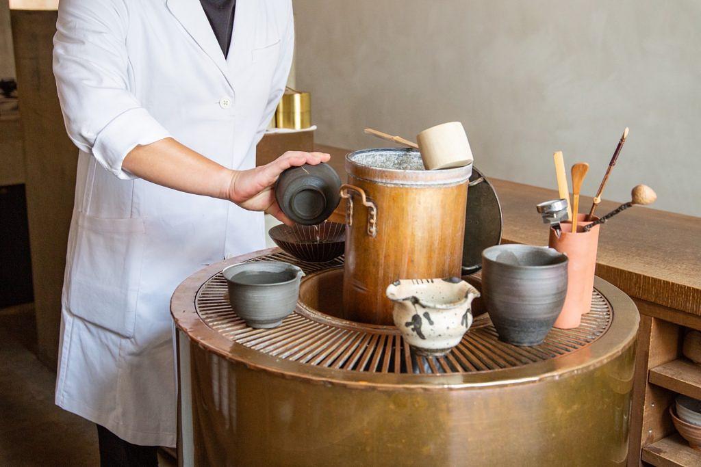 店内は、特徴的な銅製円炉を囲むカウンター席と、箱庭を愛でるソファー席。外観から内観にいたるまで、統一された美しさにこだわりが垣間見え、お茶と歴史が現代に編集されたオリジナルの茶空間が広がっています。贅沢で独特な空間で淹れられる一杯は、香り、旨味、もてなしや奥深さ、言葉では表現できない五感の総合芸術のように、日本文化をまるごと体感できているような瞬間が訪れます。温度や淹れ方によって移り変わるお茶の滋味や茶の香りを聴きながら、心安らぐ一服を愉しんでください。