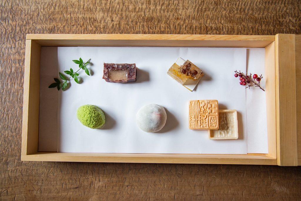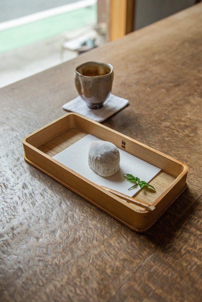 当時から茶と酒は、薬として心と体を癒したもの。白衣を着た茶司 徳淵さんが、ひとつひとつの美しい所作の中で淹れられるお茶は、心と身体、五感を満たしてくれます。品種ごとに厳選した煎茶や玉露、薄茶などの日本茶をはじめ、季節や風土を活かした和菓子、今回は福岡、志賀島にちなんだ蕗味噌のジェラートが入った「金印の最中」が興趣を添えます。夜はバーとして自家製香味酒や茶カクテルなどを選りすぐりの酒器で味わうことができます。
