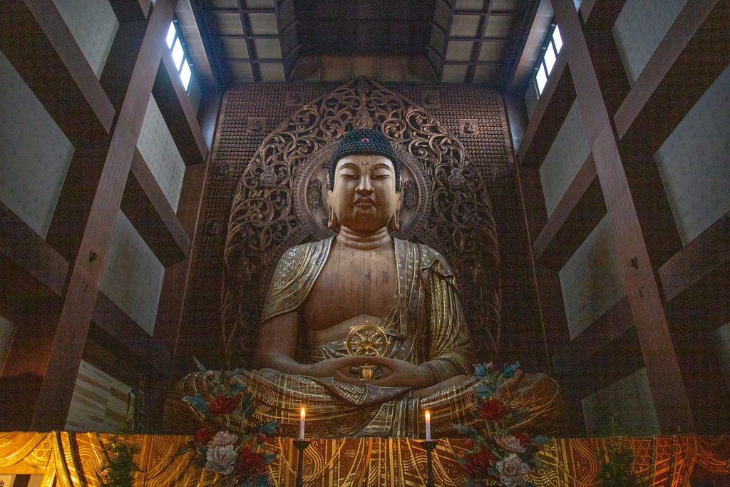 空海(弘法大師)が、 真言密教が東に長く伝わるようにと日本で最初に創建した「東長寺」。 東長寺の見どころである福岡大仏は、高さ 10.8m、重さ30tもあり、木造 (檜) 坐像では、日本最大級の大きさの大仏として知られています。