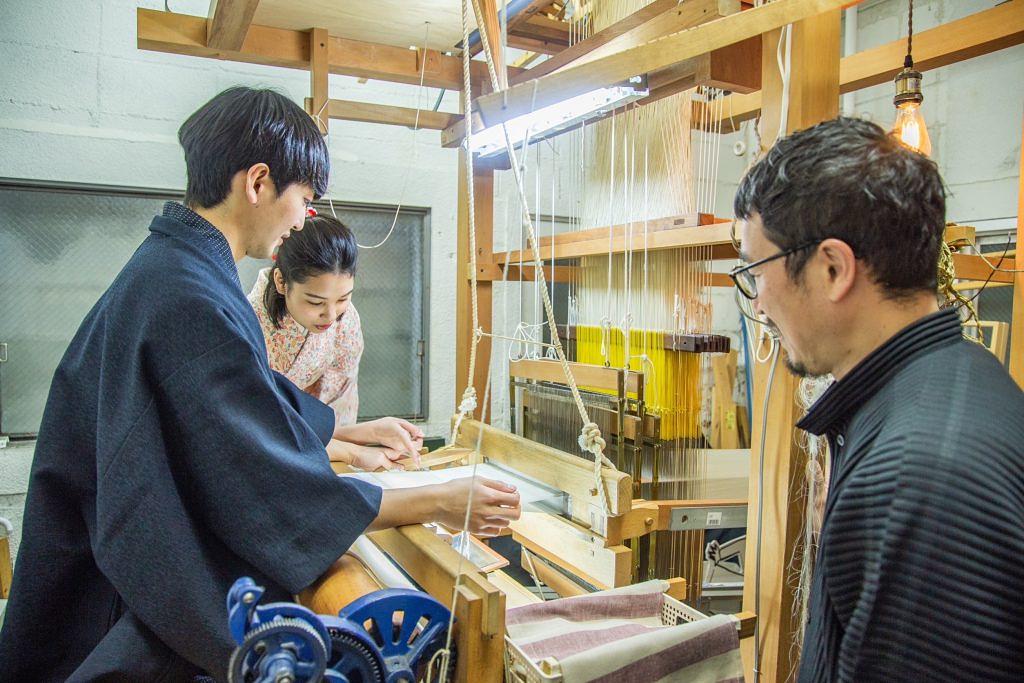 最後は博多に800年近く受け継がれている絹織物「博多織」の工房を訪れます。1235年に中国から技術がもたらされてから、博多の地で発展し、江戸時代には幕府への献上品とされた日本の三大織物のひとつです。実際に職人の実演を見学することはもちろん、見学者も職人が使う本格的な大型織機で体験ができます。こちらで作られている織物には福岡市東区の箱崎で戦前まで作られていた「箱崎縞」が数年前に復元されてから、その織物の仕立てと販売も行われていていますのでぜひ、手に取ってご覧ください。