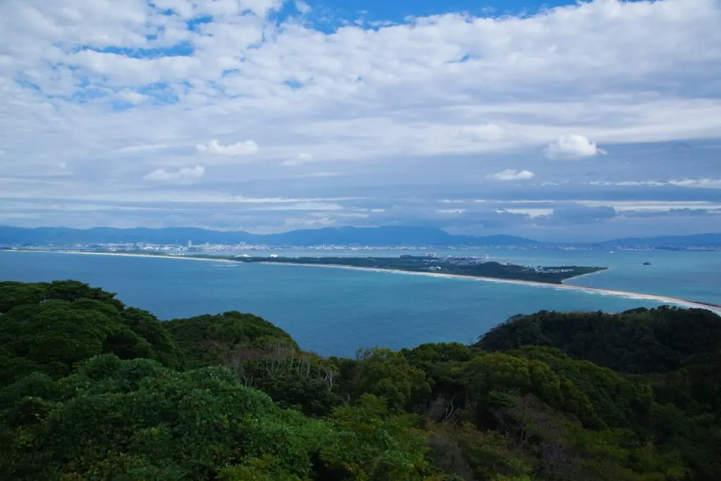 志賀島で最も高い場所にある潮見公園へも勝馬海水浴場から自転車で向かうことができます。公園内にある展望台からは海の中道や能古島、博多湾を超えて広がる福岡市街までも見ることができ、福岡の地形を見渡すことができます。