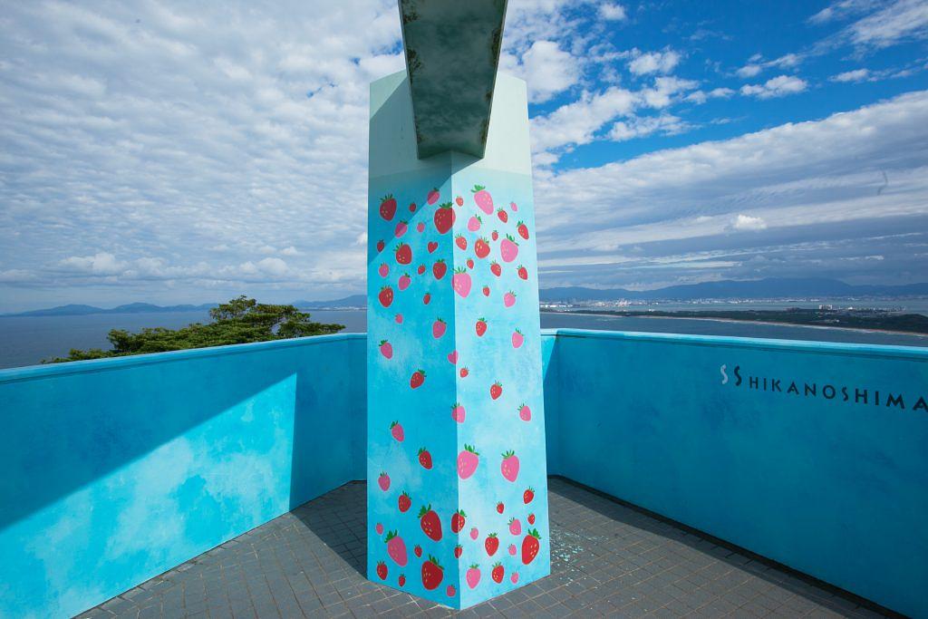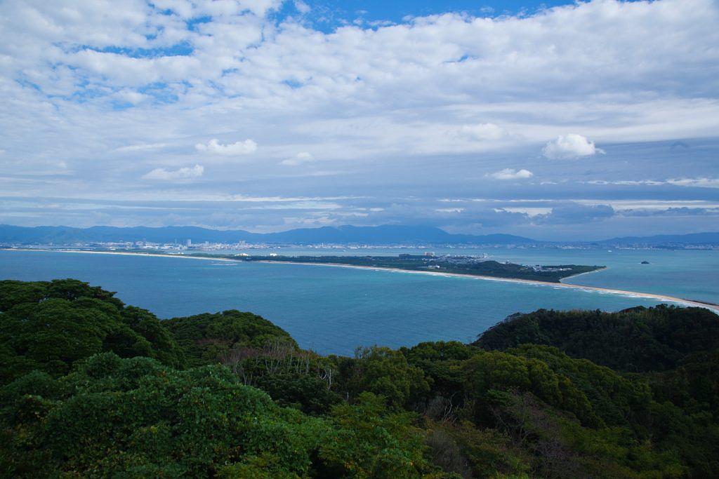 志賀島で最も高い場所にある潮見公園へも勝馬海水浴場から自転車で向かうことができます。公園内にある展望台からは海の中道や能古島、博多湾を超えて広がる福岡市街までも見ることができ、福岡の地形を見渡すことができます。