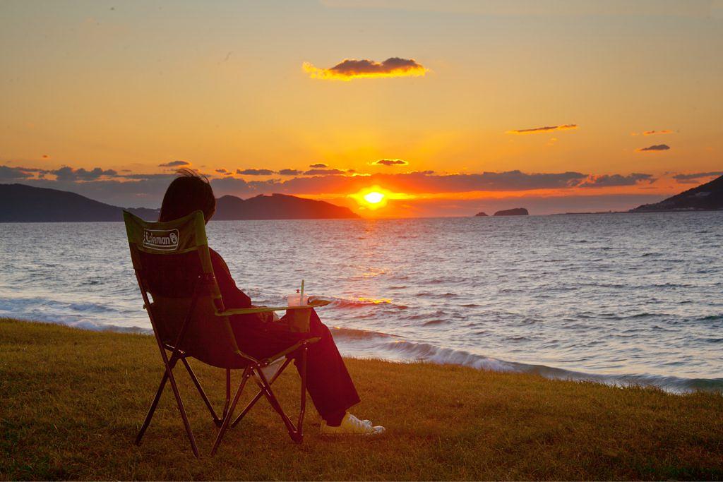 休暇村志賀島では、海辺でゆったり座れるリラックスチェアも貸し出しをしてくれます。茜色に染まる空は美しく、太陽がゆっくり海へと沈んでいく光景は幻想的。日々の喧騒から離れ、流れる時間に身をまかせてみてはいかがでしょう。※季節によって日没時間は異なります