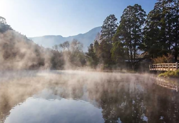 湧水や温泉が流れ込んでいるため、一年を通して水温が高めであり、冬に水を触ると温かく感じる不思議な湖。冬の冷え込んだ日の早朝に霧が現れることでも有名で、周りを囲む木々も四季折々の表情を見せる。