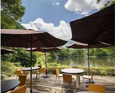 由布院の人気スポット・金鱗湖に面した、クロワッサンが自慢のベーカリーカフェ。寒い日の朝は金鱗湖の湖面から湯気が立ち上り、その幻想的な景色をテラスから楽しむことができます。
