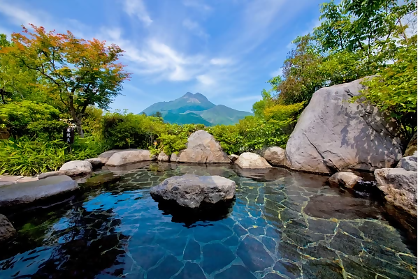 由布岳を借景にした、非日常空間の温泉宿です。客室、温泉、レストランからは雄大な由布岳が見える。豊の国の素材にこだわった料理を堪能でき、10~2月の期間限定で味わえる豊後灘産「とらふぐ」のフルコースは絶品です。