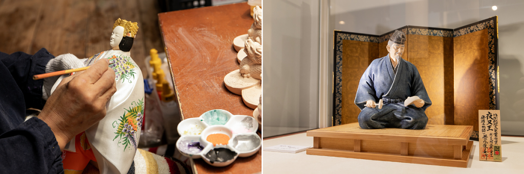 左)博多人形の絵付けの様子、(右)内閣総理大臣賞を受賞した貴重な作品も展示されています