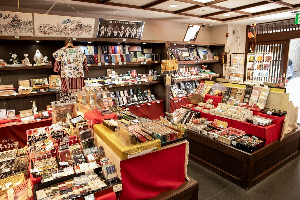 町家棟に隣接する「みやげ処」は博多らしい土産品を探すのに絶好の場所。普段使いできる博多織の小物や博多人形などの伝統工芸品、博多でおなじみの銘菓などがバラエティ豊かに揃う。