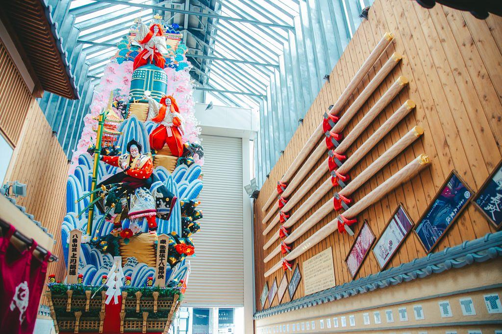 観光客のお目当ては、ぜんざいと広場中央に設置されている飾り山笠である「八番山笠上川端通」。全高約10メートルの立派な山笠は、常時近くで見られる機会はなかなかありません。他にも山笠にまつわる「当番法被」の壁面タイルや、山笠を担ぐための「かき棒」も展示され、博多の象徴でもある山笠にも間近で触れることができます。
