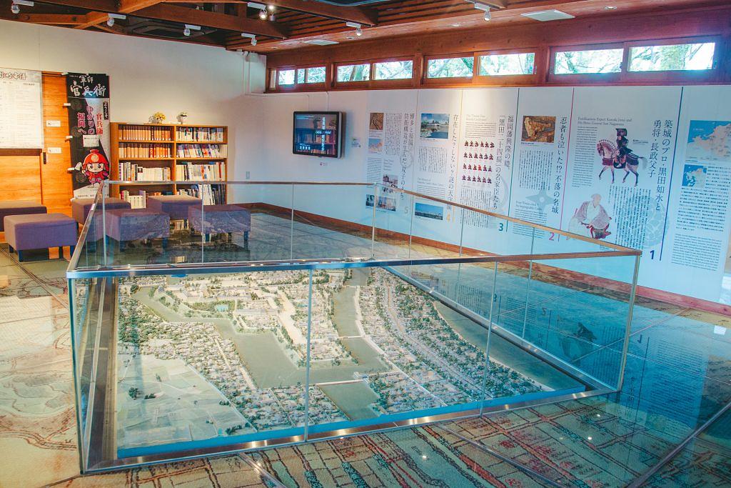 再現模型や古地図の他にも、城主であった黒田長政と父、官兵衛の物語や、在りし日の福岡城を再現したビデオなどがあり、様々な角度で福岡城が紹介されています。