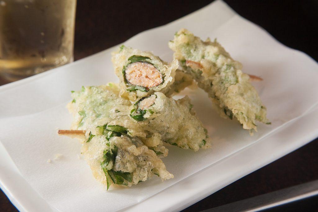 しそで包んだ明太子、衣はサクッと揚げたての天ぷら。屋台で味わう揚げたての天ぷらは特別感があり、格別の味わい。