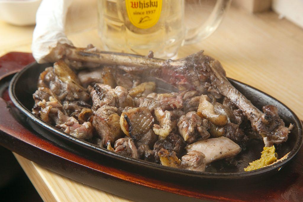 炎を上げ、炭火で一気に焼き上げていく豪快さは屋台とは思えない本格さ。焼き上がった骨付きもも一枚が、熱々の鉄板に乗ってやってきました。「僕の兄が福岡市内で、地鶏の炭火焼きのお店をしているんですよ。朝引きの糸島産地鶏を使用しています。ピリ辛の柚子胡椒を付けて、熱いうちに召し上がってください。」歯ごたえのある地鶏は旨味が凝縮され、柚子胡椒との相性は抜群。