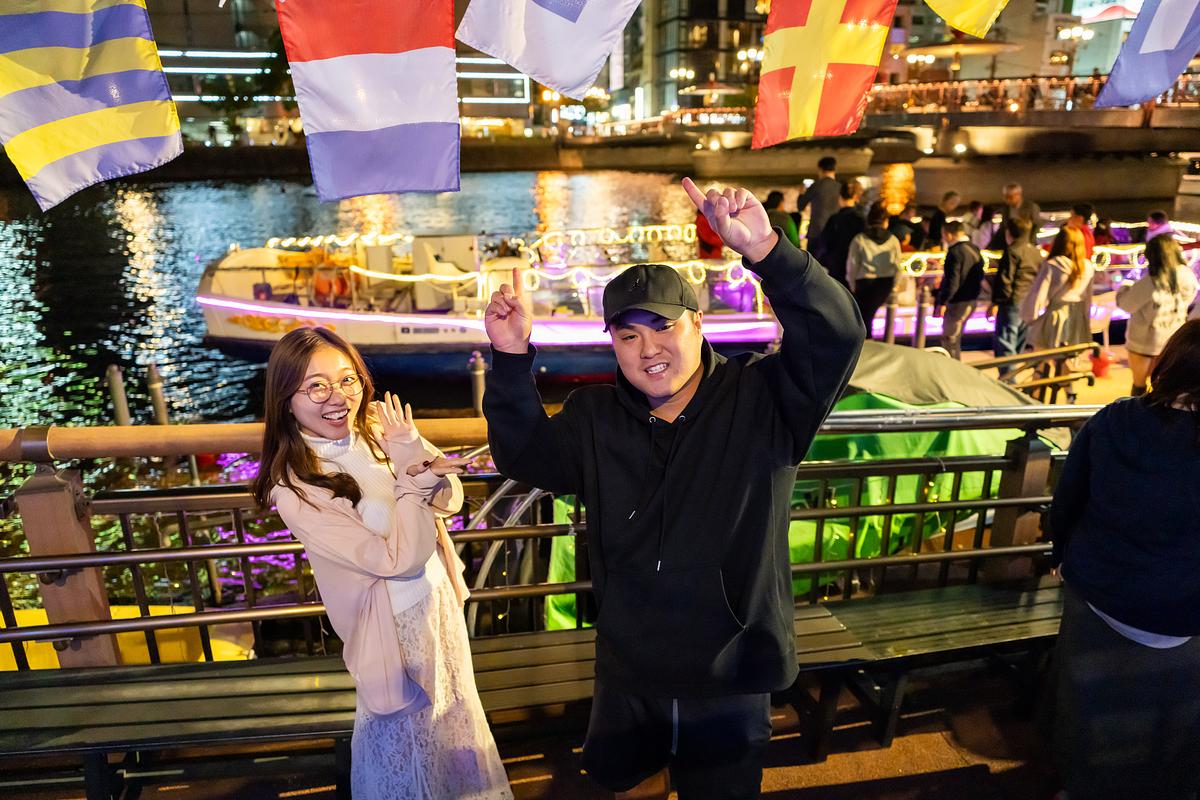 乗船しているガイドさんのトークや歌で盛り上がりながら船は進み、川沿いに立ち並ぶ福岡名物の屋台や橋の上にいる方々とお互いに手を振って交流することも。