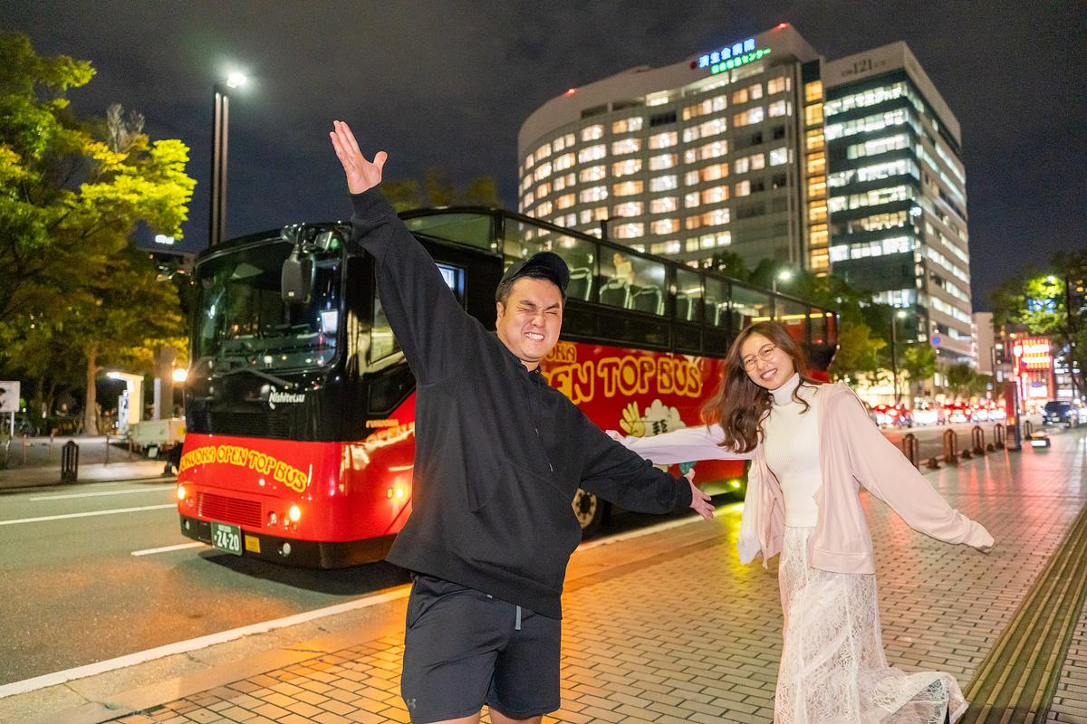 屋根のない座席から福岡の夜景を体感できる「福岡オープントップバス」。風をダイレクトに感じながら、ジェットコースターのようなスリルと美しい景色に、2人とも大満足でした!