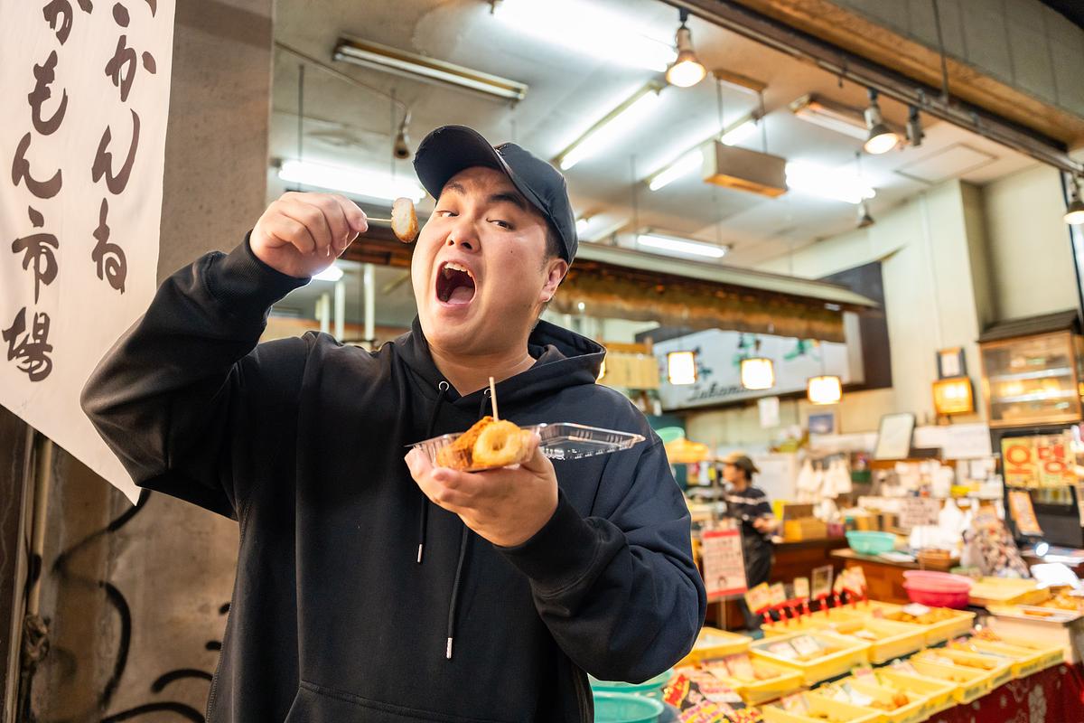 豪快にいただくカイセイさん。「ギョロッケはふかふかの食感で味が濃く、とんこつラーメンは実際のラーメンの素材を使っていて個性的な味で、ちくわは噛めば噛むほど旨みが溢れ出して、食べ歩きにぴったりですね」とのこと。